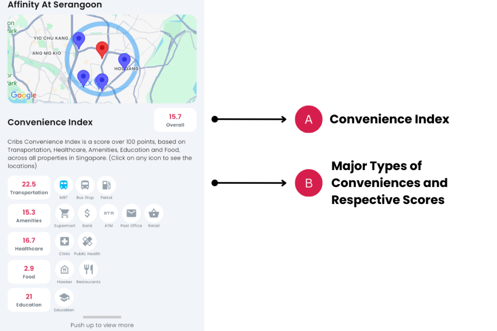 Depending on the number of physical locations of these conveniences, a score will be given to each property. These scores are normalised across all Private Properties and HDB Flats across Singapore. It is one of the most popular features in Cribs, given that it provides concise information regarding the Convenience Index score of the property and indicates if there are sufficient conveniences that meet the user’s needs at a glance.