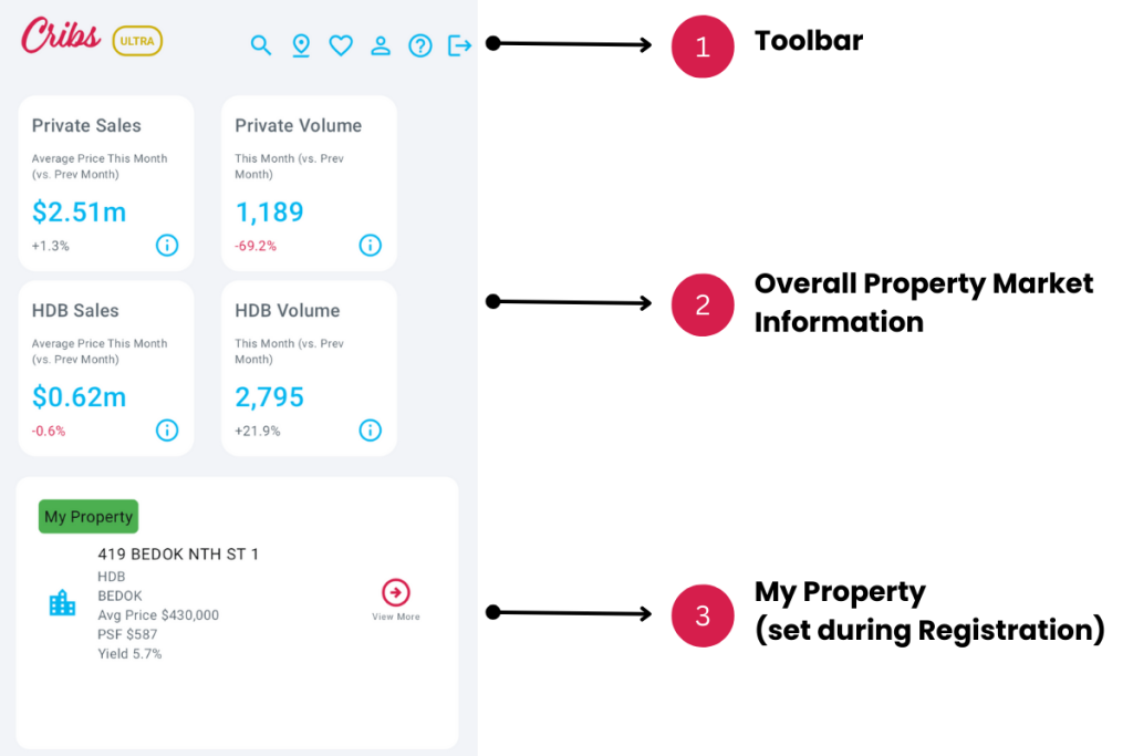 Home page allows users to access all the commonly used functions and features of Cribs. There are numerous widgets that show the overall market information, user profile and affordability information.