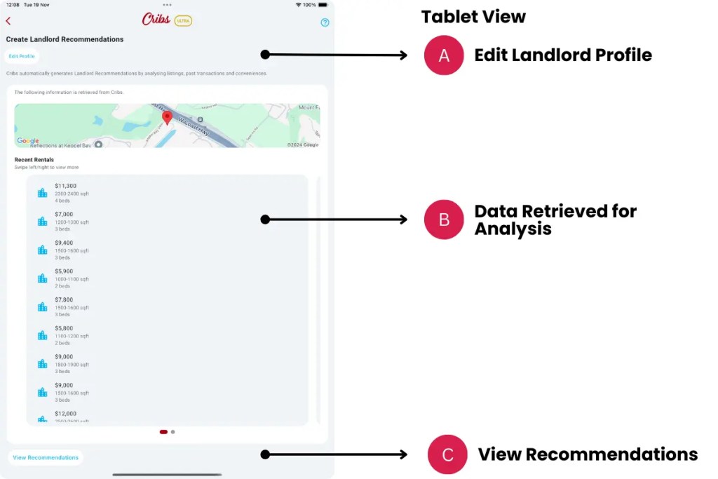 To start, first Edit the Preferences (or use the preference that was set up during the Lead Creation process). A list of Recent Rentals, Vicinity Rentals and Listings will appear that has been found by Cribs using AI. Once this has been found, tap on View Recommendations and AI will analyse the pricing and provide a suggestion on the listing advertisement.