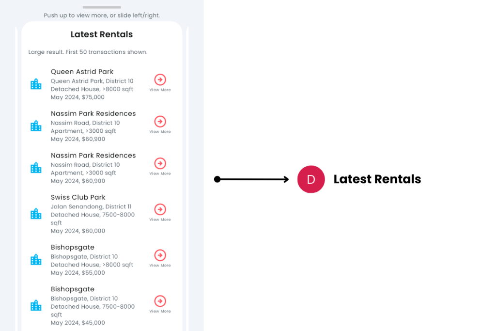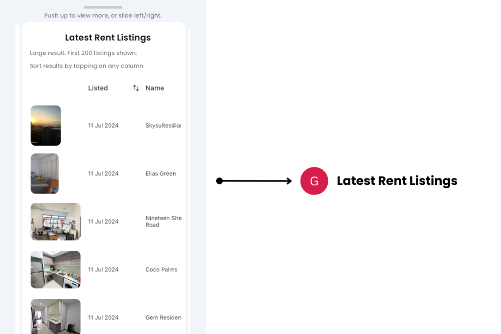The Latest Sale Listings and Latest Rental Listings sections display listings from major property platforms in Singapore. Tapping on any row will redirect you to the platform’s listing of the property.