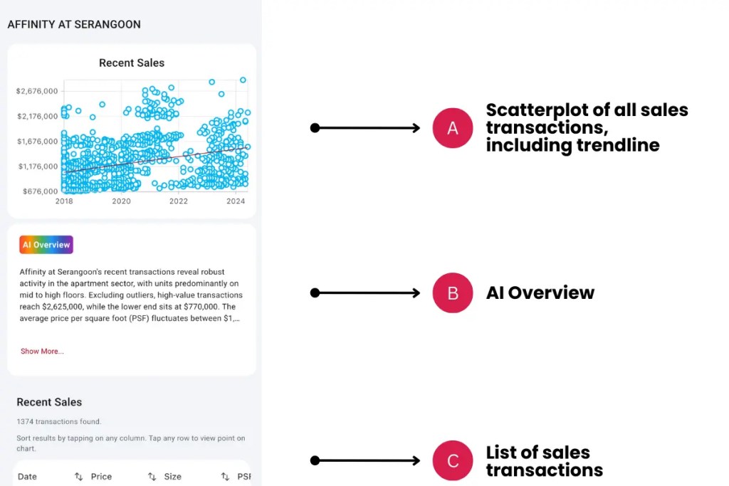 - Description: The list of sales transactions of the property – contract date, property type, size (in sqft), PSF and price.